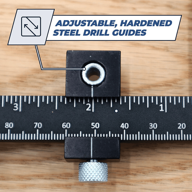 Ya sea que esté instalando una perilla nueva o docenas de tiradores grandes, de 1 ¾" a 12" de centro a centro, Cabinet Hardware Jig Pro es la opción ideal para garantizar precisión y consistencia de nivel profesional en todo momento. Un tope final móvil y escalas de medición integradas (con marcas imperiales y métricas) facilitan la colocación de perillas y tiradores con precisión.