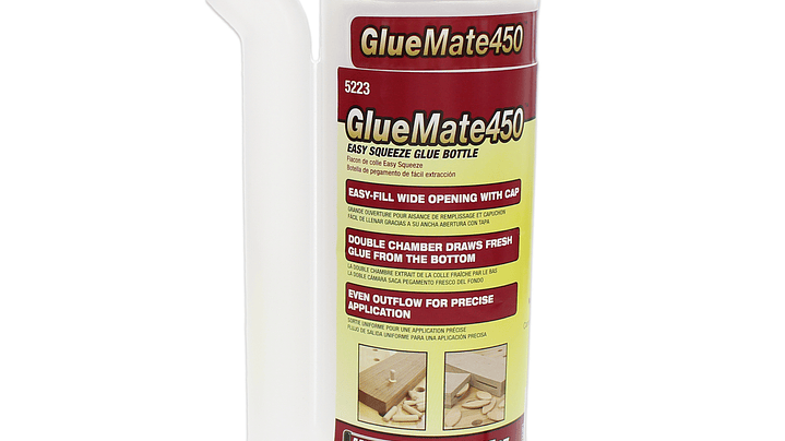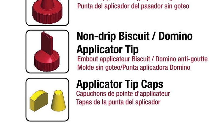 Con el GlueMate450™ se incluyen 2 consejos de aplicación diferentes. Un aplicador de cono de punta fina le permite colocar una fina gota de pegamento en tablas estrechas o en agujeros para pasadores u otras juntas. La punta plana del aplicador de galletas tiene un perfil ancho, lo que la hace ideal para unir galletas o simplemente para esparcir una gota más ancha de pegamento en tablas más grandes.
