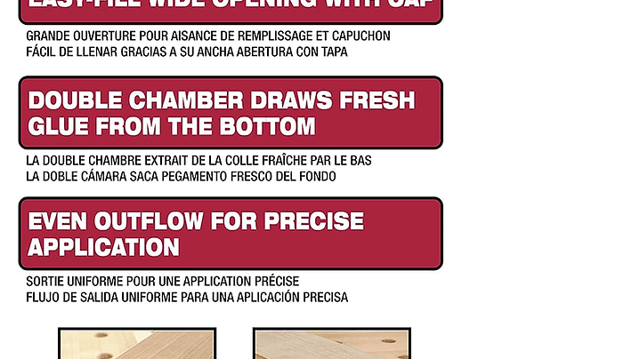 - Tiene capacidad para 15 onzas. de pegamento para madera u otros líquidos